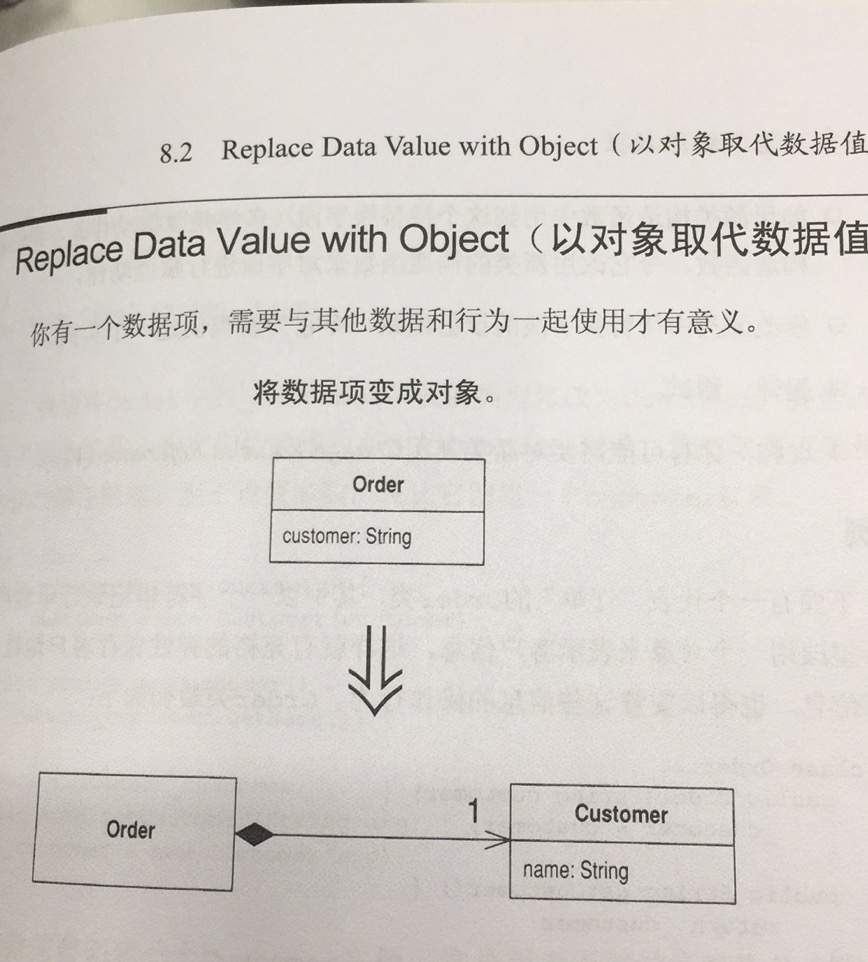 - 讲过程化设计转换为对象设计:将数据变成对象,将大块的行为分成小块,并将行为移入相关对象之中。