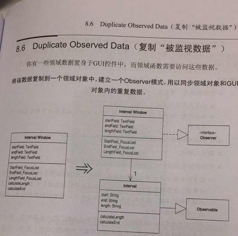 - 复制“被监视数据”:将数据复制到一个领域对象中,简历一个Observer模式,用以同步领域对象和GUI对象内的重复数据。
