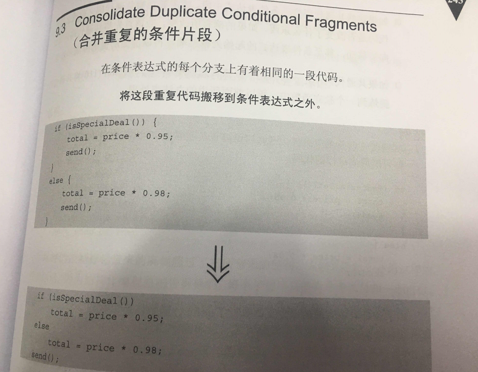 - 合并重复的条件片段:将这些重复代码搬移到条件表达式之外。