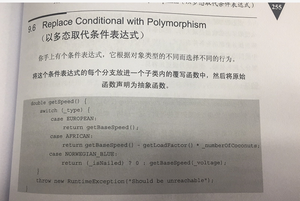 - 以多态取代条件表达式:将这些条件表达式的每个分支放进一个子类内的腹泻函数中,将原始函数沈明伟抽象函数。