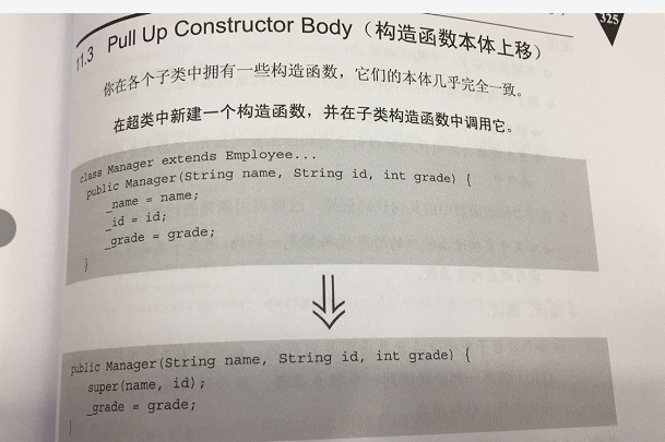 - 构造函数本体上移:在超类中新建一个构造函数,并在子类构造函数中调用它。