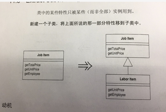 - 提炼子类:新建一个子类,将上面所说的一部分特性移到子类中。