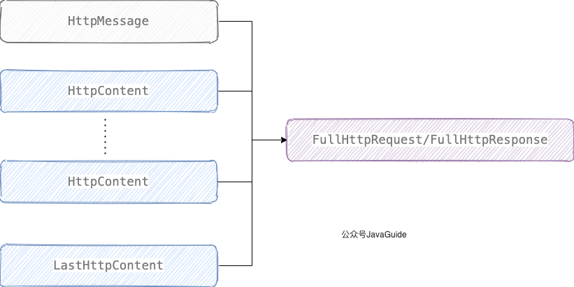HttpObject: 整个 HTTP 消息体系结构的最上层接口。HttpObject接口下又有HttpMessage和HttpContent两大核心接口。HttpMessage: 定义 HTTP 消息,为HttpRequest和HttpResponse提供通用属性HttpRequest:HttpRequest对应 HTTP request。通过HttpRequest我们可以访问查询参数(Query Parameters)和 Cookie。和 Servlet API 不同的是,查询参数是通过QueryStringEncoder和QueryStringDecoder来构造和解析查询查询参数。HttpResponse:HttpResponse对应 HTTP response。和HttpMessage相比,HttpResponse增加了 status(相应状态码) 属性及其对应的方法。HttpContent: 分块传输编码(Chunked transfer encoding)是超文本传输协议(HTTP)中的一种数据传输机制(HTTP/1.1 才有),允许 HTTP 由应用服务器发送给客户端应用( 通常是网页浏览器)的数据可以分成多“块”(数据量比较大的情况)。我们可以把HttpContent看作是这一块一块的数据。LastHttpContent: 标识 HTTP 请求结束,同时包含HttpHeaders对象。FullHttpRequest和FullHttpResponse:HttpMessage和HttpContent聚合后得到的对象。