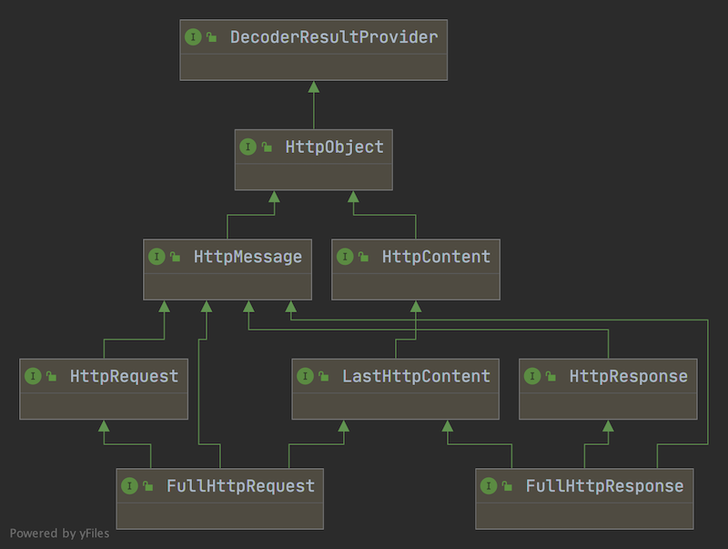 为了能够表示 HTTP 中的各种消息,Netty 设计了抽象了一套完整的 HTTP 消息结构图,核心继承关系如下图所示。