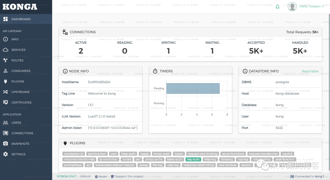Konga (官网地址:https://pantsel.github.io/konga/,Github地址:https://github.com/pantsel/konga)可以很好地通过UI观察到现在 Kong 的所有的配置,并且可以对于管理 Kong 节点情况进行查看、监控和预警。Konga 主要是用 AngularJS 写的,运行于nodejs服务端。具有以下特性: