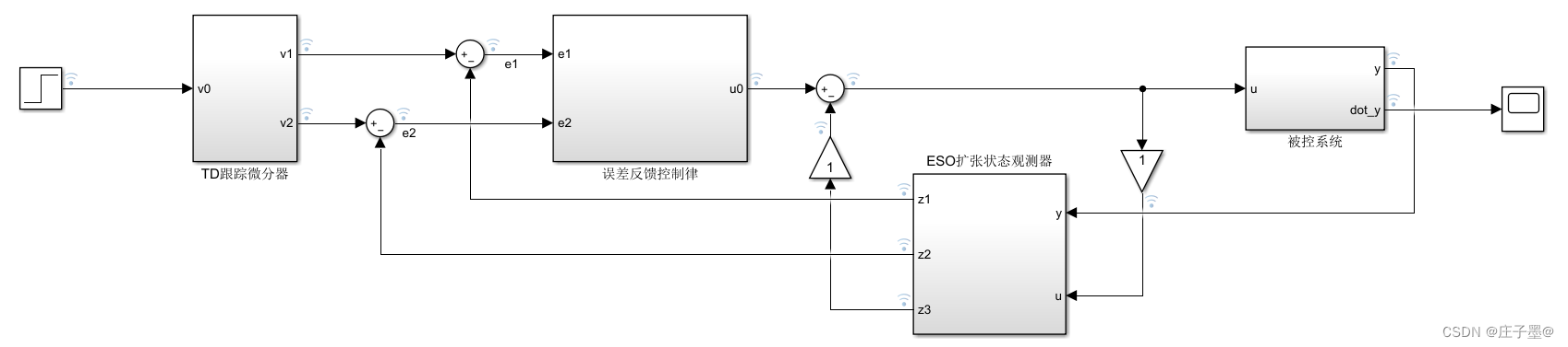 本案例中的simulink仿真整体结构(为便于理解,结构图与上述ADRC整体结构类似)