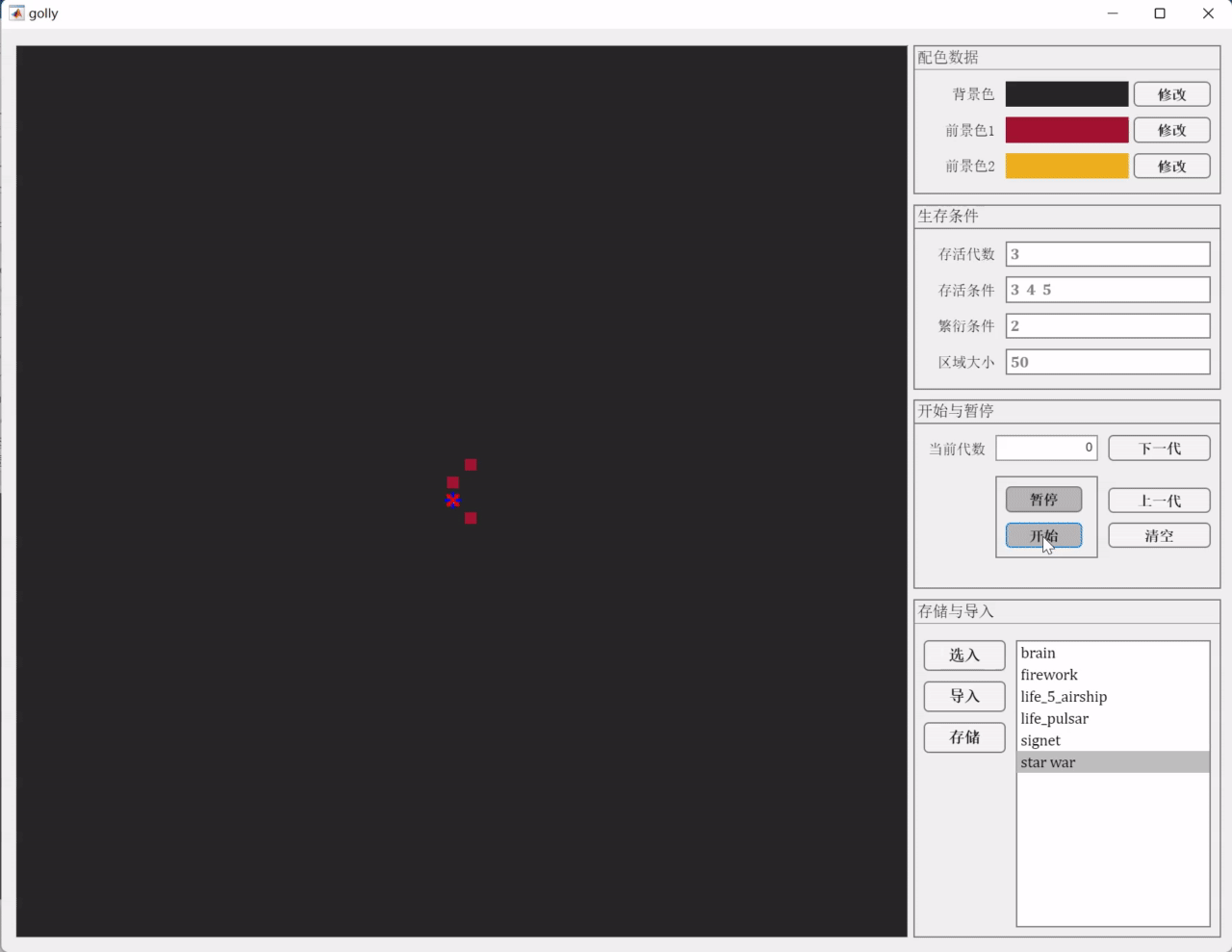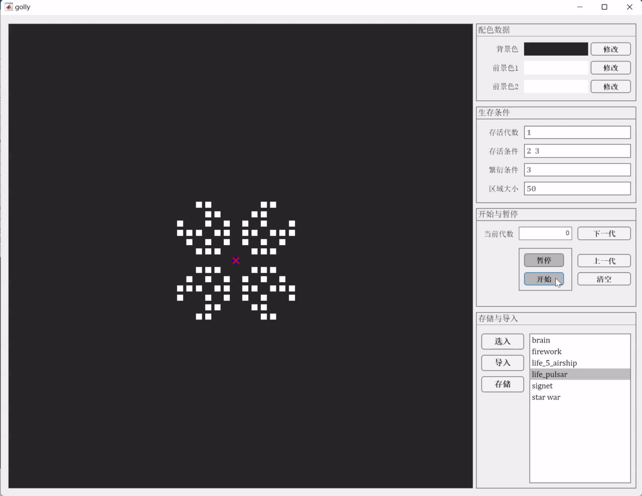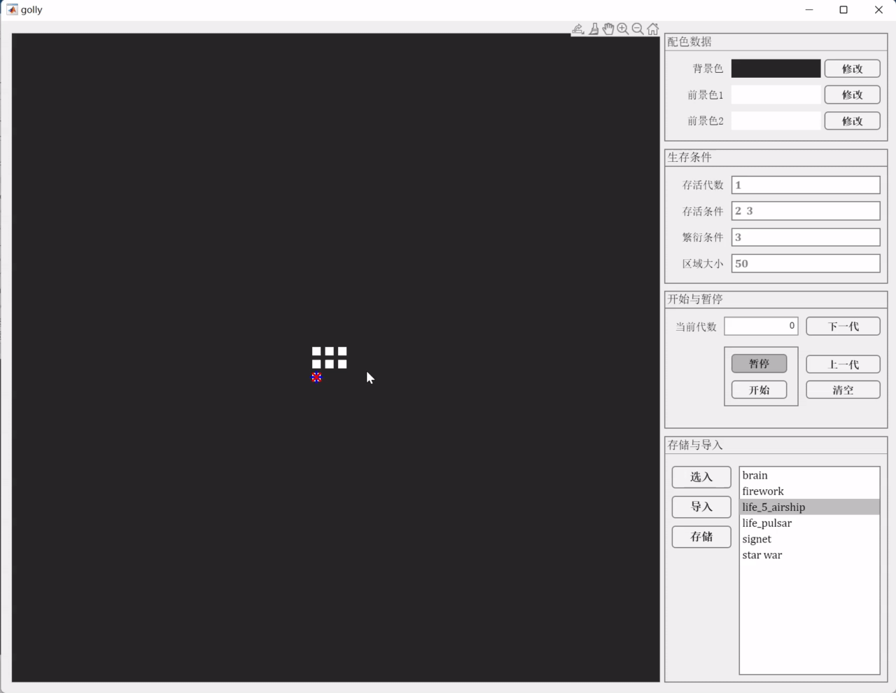 以上是生命游戏最基本的规则,但我们可以对其进行更多的设定,比如一个细胞即使资源匮乏也可以存活一段时间,比如定义周围有5、6个细胞才是恰到好处,因此,参考软件golly本人使用MATLAB的App Designer功能制作了这个小软件(请尽量使用较新版本)。