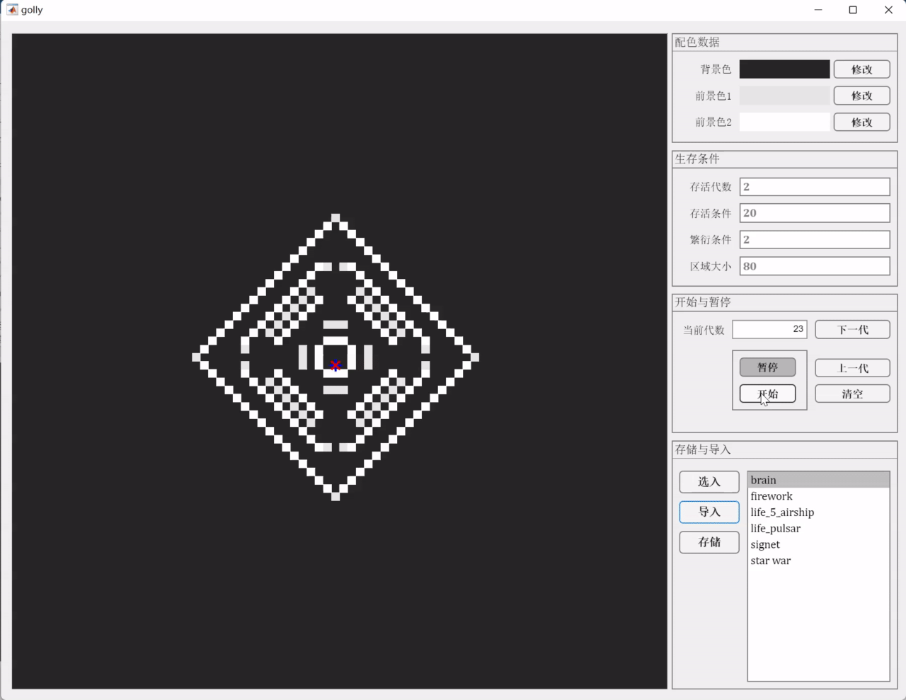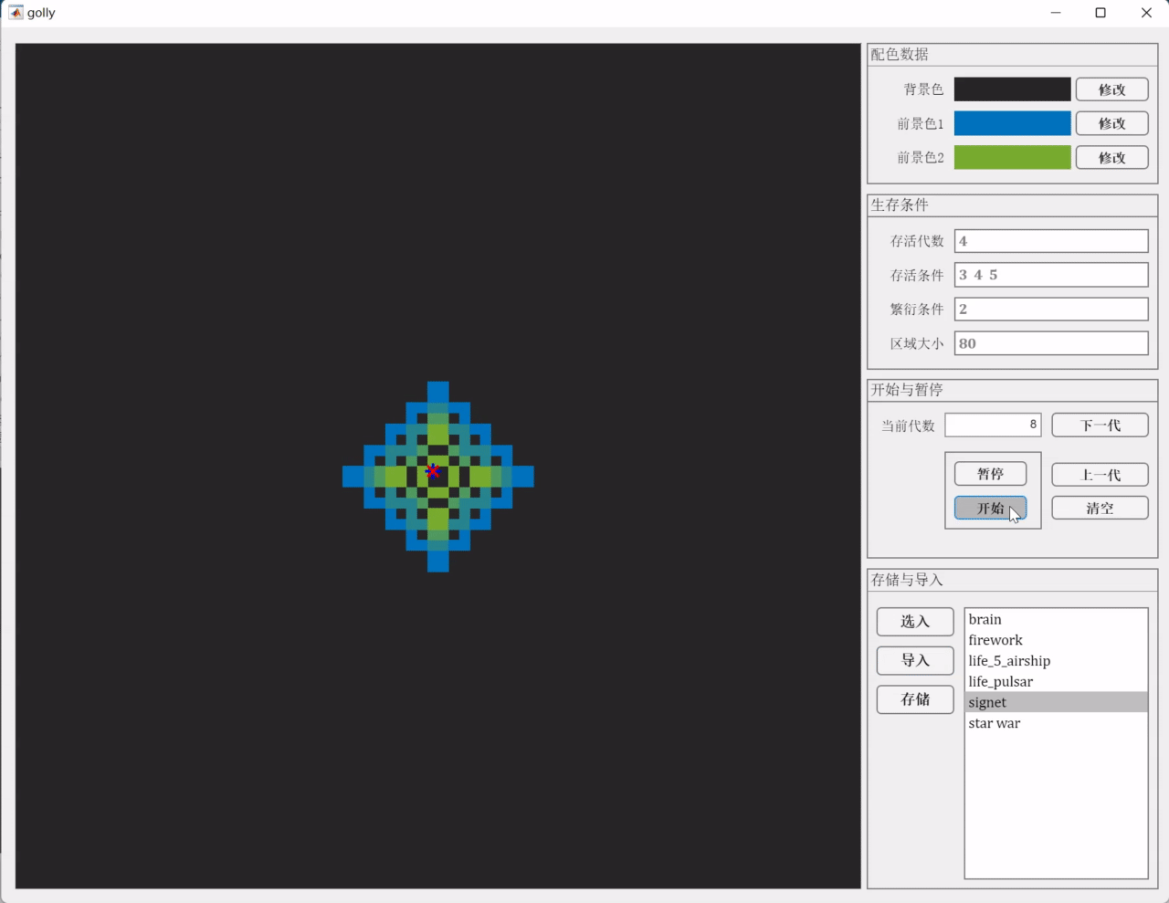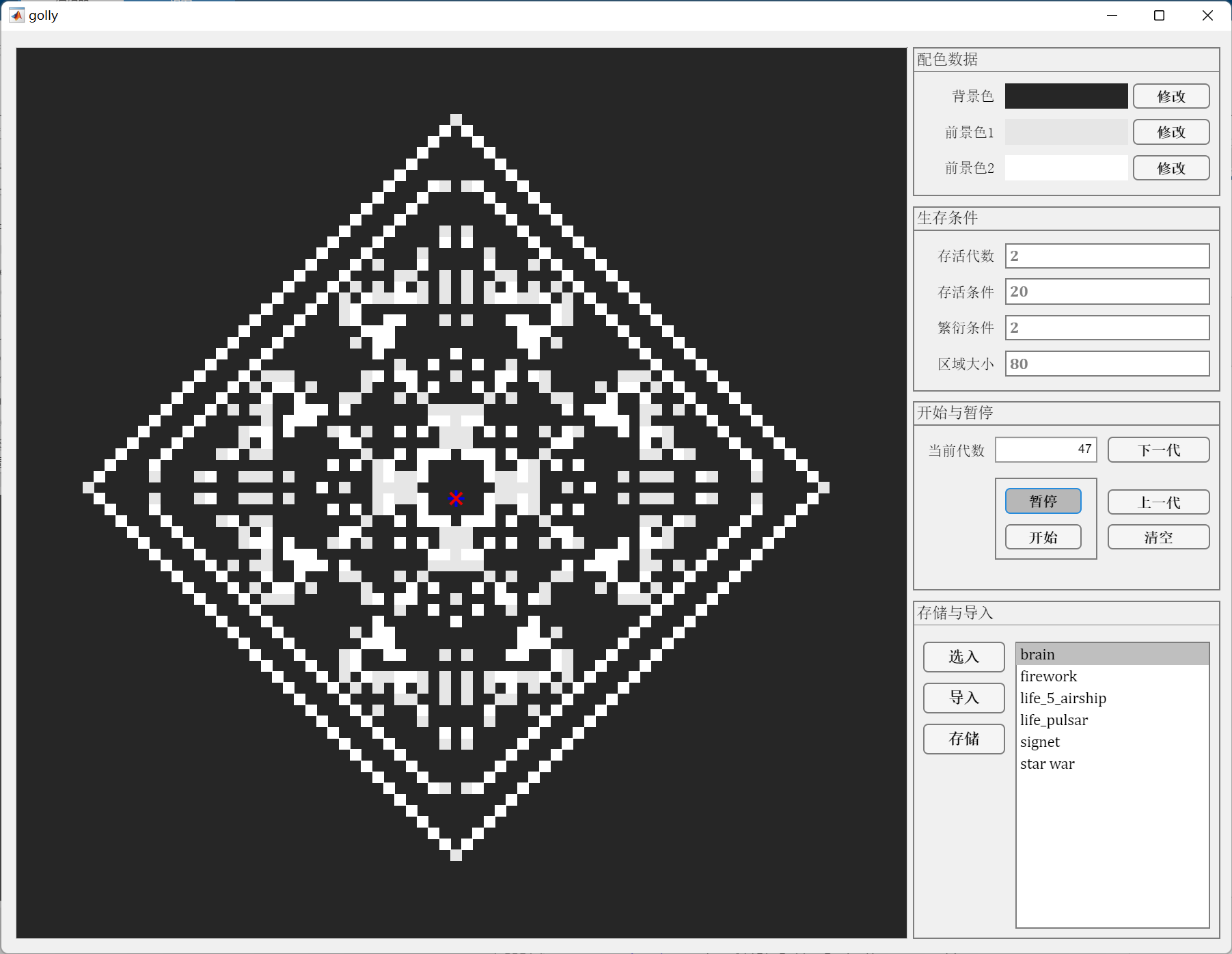 以上是生命游戏最基本的规则,但我们可以对其进行更多的设定,比如一个细胞即使资源匮乏也可以存活一段时间,比如定义周围有5、6个细胞才是恰到好处,因此,参考软件golly本人使用MATLAB的App Designer功能制作了这个小软件(请尽量使用较新版本)。