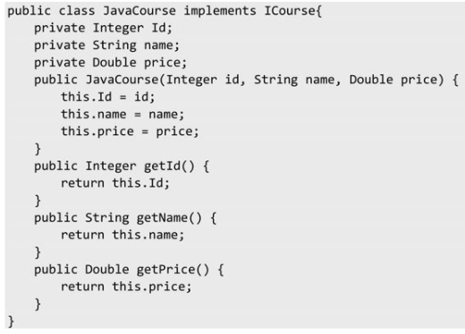 现在要给Java架构课程做活动,价格优惠。如果修改JavaCourse中的getPrice()方法,则会存在一定风险,可能影响其他地方的调用结果。如何在不修改原有代码的前提下,实现价格优惠这个功能呢?我们再写一个处理优惠逻辑的类——JavaDiscountCourse类(可以思考一下为什么要叫JavaDiscountCourse,而不叫DiscountCourse)。