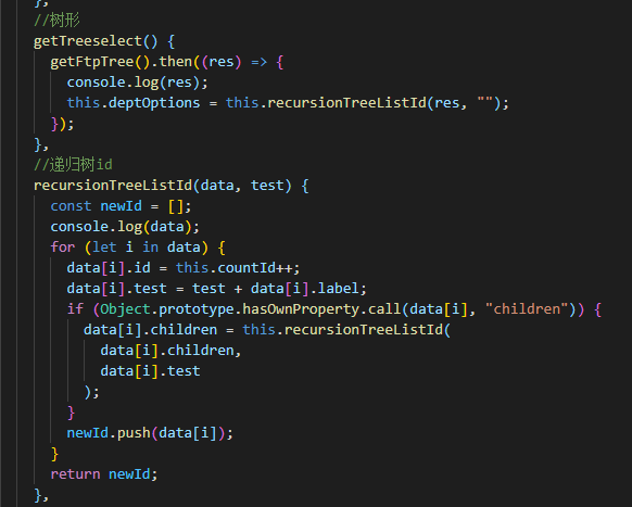 然后最重要的就是找到退出递归的条件,这个条件就是当父没有子的时候,此时用到一个Object.prototype.hasOwnProperty.call(),这个原理我也不太懂,个人感觉挺难的,作用就是判断我的父中有没有children了。判断之后就让子调用treeListId函数,完成递归功能。