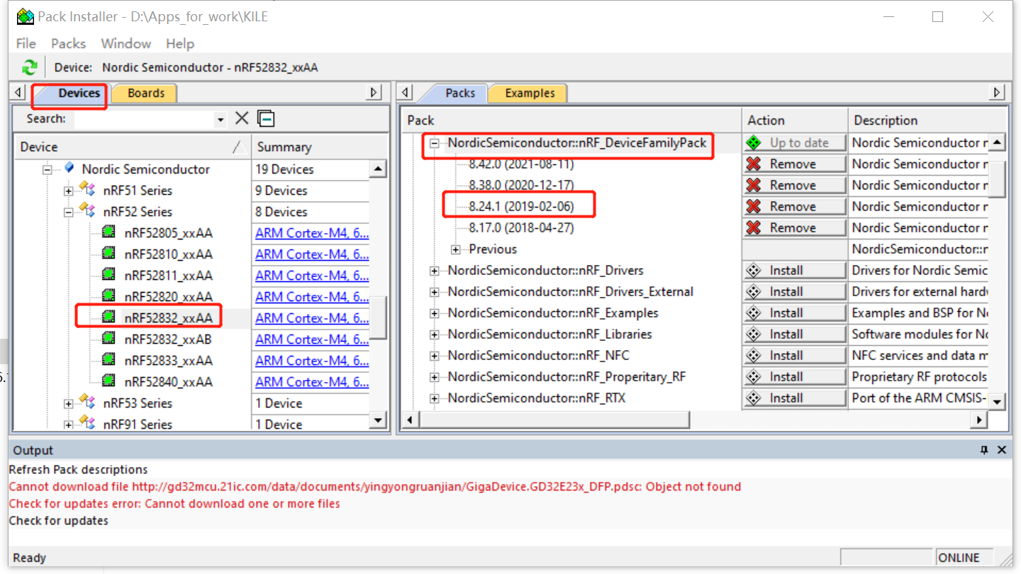 Cannot execute external request (Install Pack, "NordicSemiconductor:nRF_DeviceFamilyPack"): Pack not found