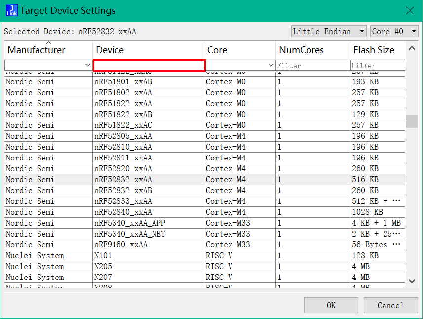 选择USB,在Specify Target Device中点击出现下面的弹窗,在红框内输入nRF52832_xxAA回车后双击选定。最后依次选择上图红框选项点击OK完成设置。