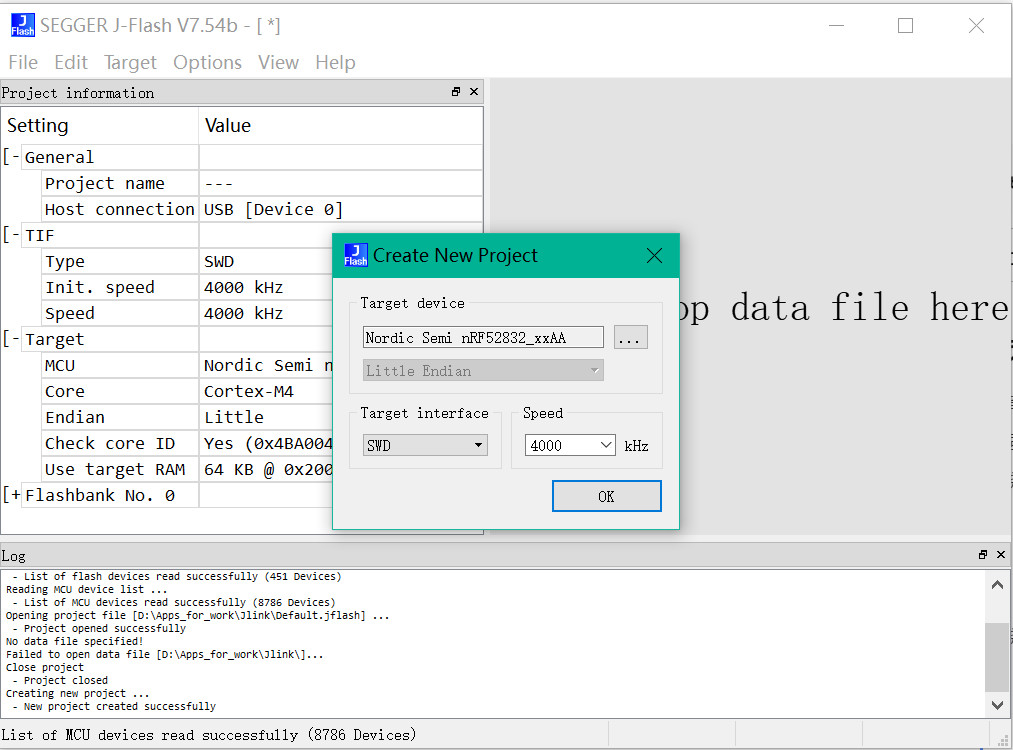 日志查看使用 J-Link RTT Viewer 软件。下载完成后,在开始菜单中搜索 J-Flash Vx.xxb(x.xx 版本号)并打开,点击 File->New Project 芯片选择 nRF52832_xxAA 点击OK。