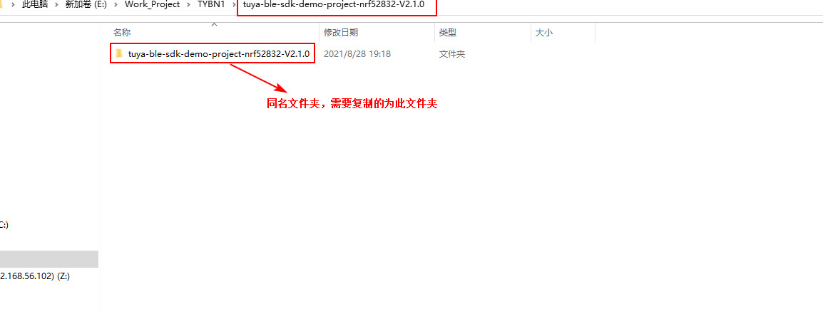 在环境搭建中,硬件开发步骤选择相应的模组(本次为TYBN1)后,下载该模组对应的sdk资料,解压完成后打开 tuya-ble-sdk-demo-project-nrf52832-V2.1.0 文件夹会出现与其同名的文件夹。