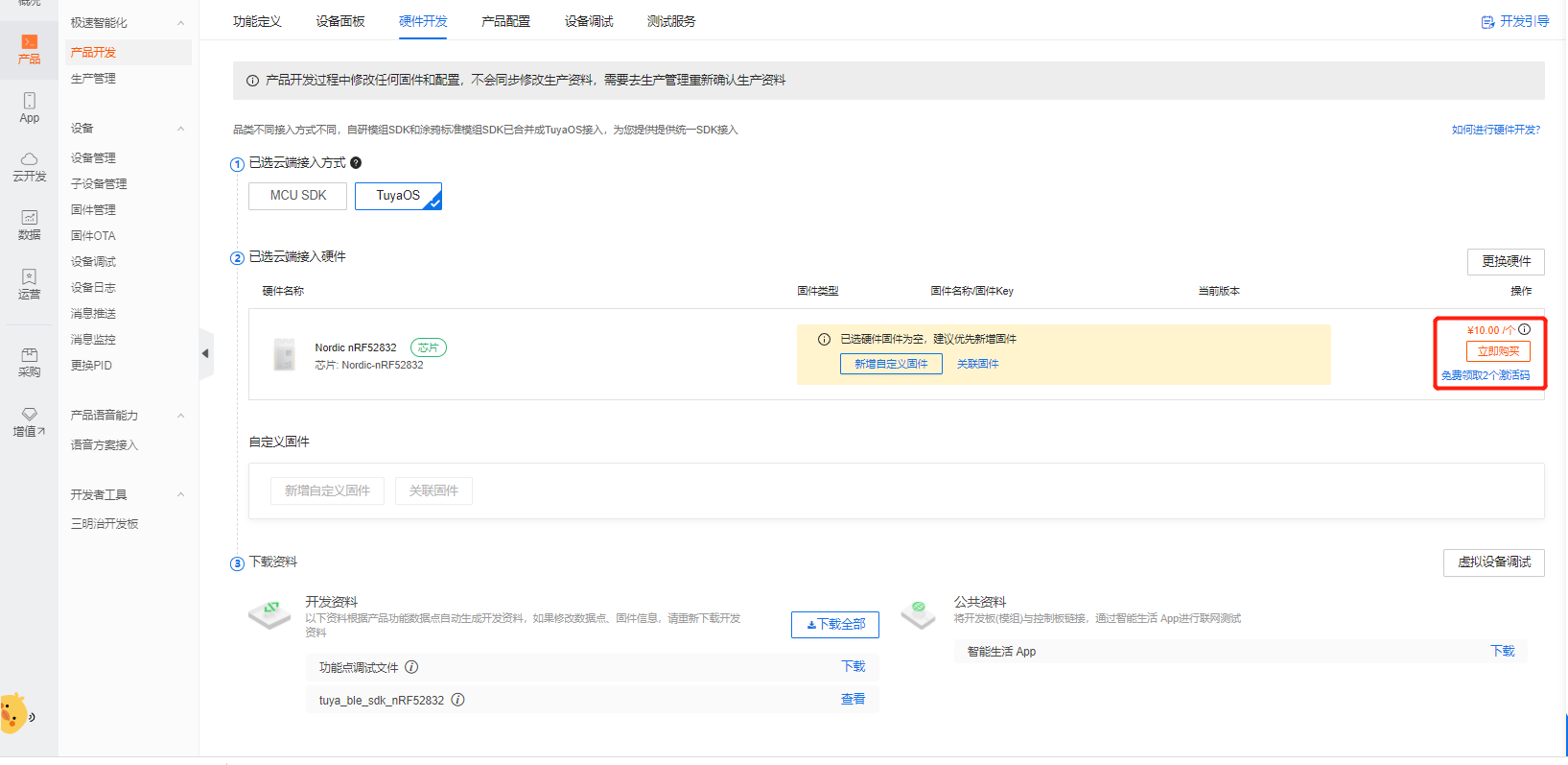 默认选择全部的功能点(随意删除可能会导致面板数据丢失或无法打开面板等情况)。面板选择温湿度Studio面板,在硬件开发中,选择相应的模组即可,最后领取激活码用于后续开发。