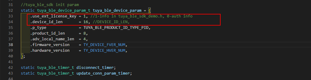 在tuya_ble_sdk_demo.c文件中将 use_ext_license_key、device_id_len 的值分别改为1、DEVICE_ID_LEN(16),否则上步修改的uuid、auth_key等不会生效。