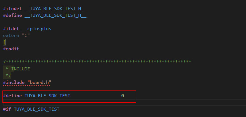 打开工程目录 tuya_ble_sdk_demo 下的 tuya_ble_sdk_test.h 文件,将第29行宏定义 TUYA_BLE_SDK_TEST 关闭,该宏为测试模式的开关,打开会导致测试功能模块占用相关IO口资源使部分IO口以及相关外设无法正常使用