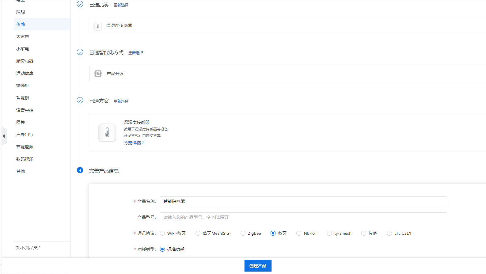 智能除味器本次用到了温湿度传感器的面板,因此,在创建产品时选择传感品类下面的温湿度传感器,通讯方式选择蓝牙。