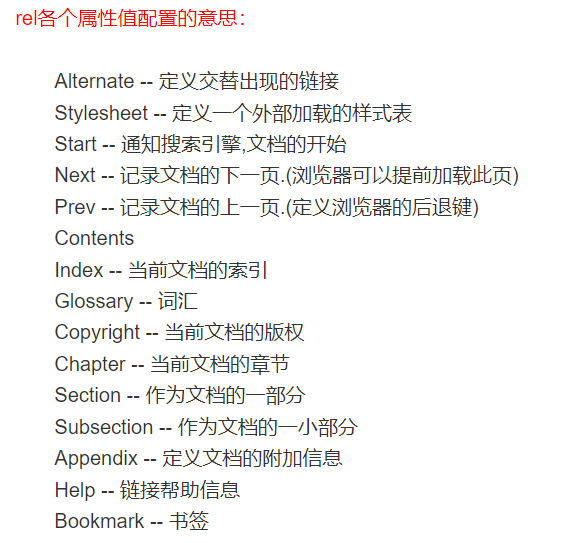Link标签是用于当前文档引用外部文档的,其次,这个标签的rel属性用于设置对象和链接目的之间的关系,说白了就是指明了链接进来的对象是什么东西