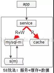 业务层不直接面向db和cache,服务层屏蔽了底层db、cache的复杂性。为什么要引入服务层,今天不展开,58采用了“服务+数据库+缓存一套”的方式提供数据访问,用cache提高读性能。