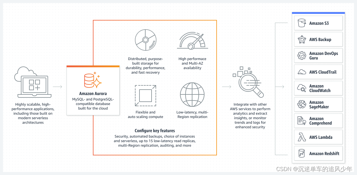 Amazon Aurora 提供内置的安全性、几乎连续的备份、无服务器计算、最高 15 个只读副本、自动多区域复制以及与其他 AWS 服务的集成。