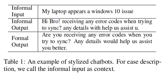 S2S框架(Sutskever、Vinyals和Le 2014)近年来取得了巨大成功。然而,大量的任务要求S2S模型在没有大量并行数据的情况下生成特定风格的文本,例如chatbots中的正式响应生成,这是一种需求量很大但性能不太好的方法(Shum、He和Li 2018)。表1显示,正式回复对于聊天机器人非常重要,特别是在客户服务领域。