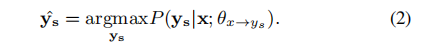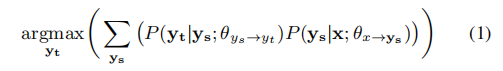 其中θys→yt和θx→ys是在D和S上通过极大似然估计得到的两个参数,由于存在指数搜索空间,译码过程通常用两步近似。第一步是根据上下文x生成ys,公式如下: