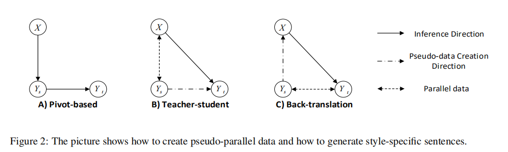 由于这项任务可以被视为一个特定的多语言机器翻译问题,作者采用了三种低资源机器翻译的方法作为基线:1)基于枢轴的方法(Cohn和Lapata 2007),以流水线的方式进行风格化的S2S生成;2)师生模型(Chen等人。2017)通过知识蒸馏解决错误传播;3)能够利用非并行数据的反向转换方法(Sennrich、Haddow和Birch 2016a)。实证结果表明,以轴为基础的模型是最差的,说明采用最先进的序列到序列模型和样式转换模型相结合的方法不能很好地解决这一问题。教师-学生法和后向翻译法在不同的度量指标上获得了最高的分数,说明知识提取和数据扩充可以减轻任务的一些挑战。