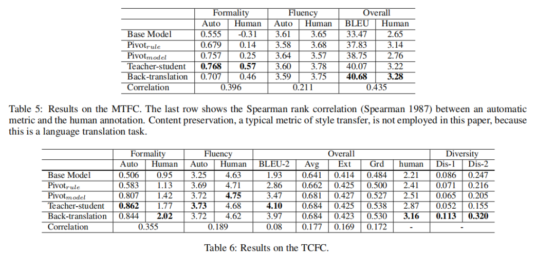 人因评价:在MTFC方面,反译法和师生法在整体质量上排名第二,因为它们都通过端到端的模型来完成这项任务,从而避免错误传播。教师-学生法在形式上得分最高,因为1)教师模型给出的形式模式对于神经模型更容易学习,2)反向翻译的伪数据可能含有噪声。正如预期的那样,数据透视模型不能很好地处理任务,在整体质量上甚至比数据透视规则还要差。在观察输出后,pivotmodel有时会漏掉一些重要的词,从而增加风格转换中的输出形式,严重影响翻译质量。BLEU分数不好的另一个可能原因是D(即数据透视模型的训练数据)的主题可能与数据集S的主题略有不同。所有模型在流畅性方面都显示出可比较的结果,因为它们的解码器都基于能够生成可信句子的神经模型。TCFC的趋势与MTFC相似。TCFC数据集上的正式程度和流利程度得分略高于MTFC。一个可能的解释是,会话中的输出语句更短,更通用,因此更容易转换。