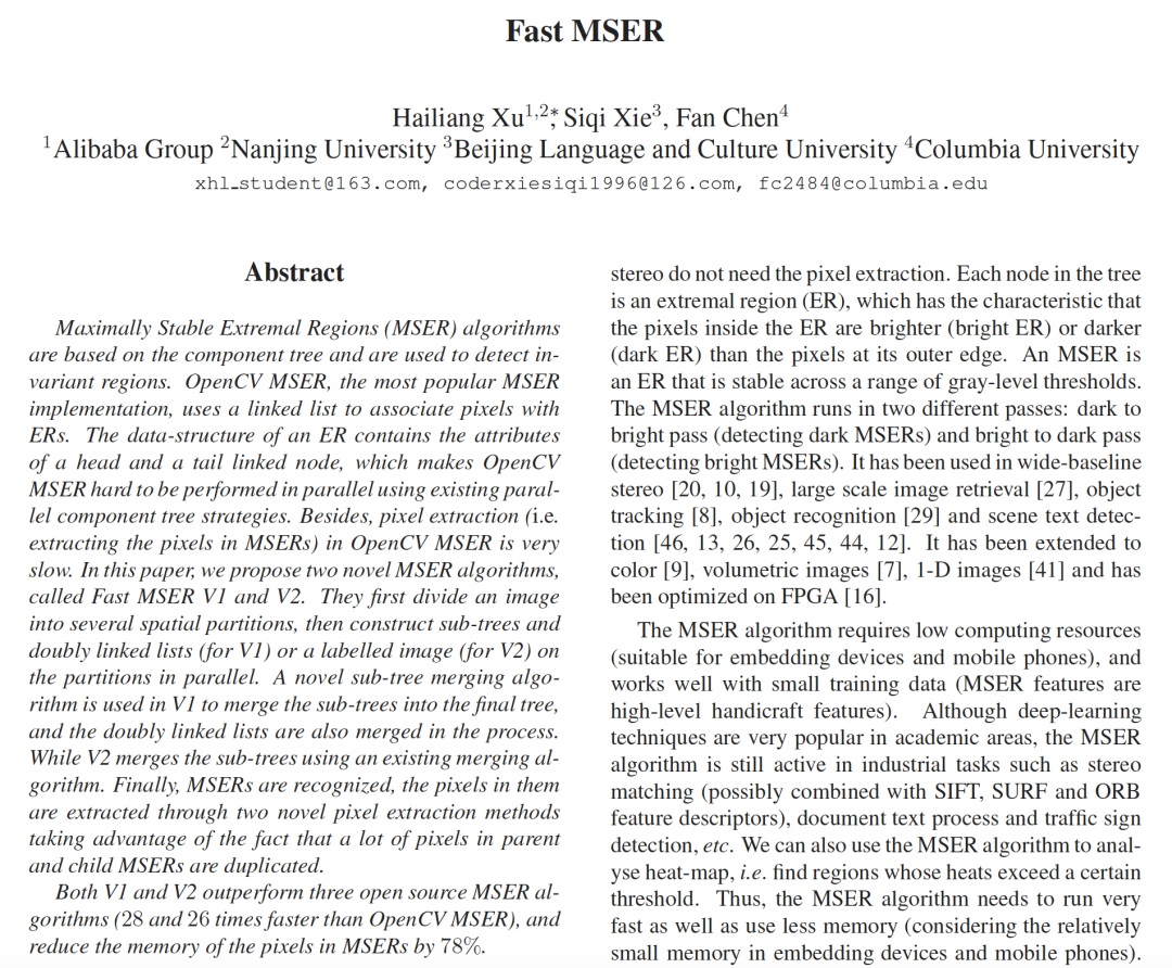 下面这篇论文严格来说是并不是OCR或DAR领域的论文(属于计算机视觉及图像处理基础化技术的论文),但鉴于MSER曾经是文字检测领域最重要的方法之一,故小编也把此文列入。