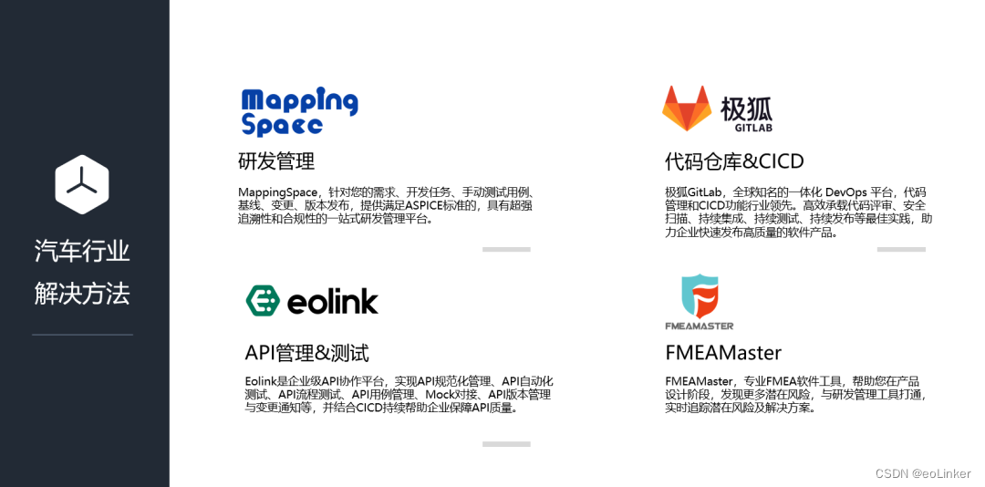 而今天非常荣幸,能与 MappingSpace、Gitlab 极狐、FMEAMaster 三家——在各自领域作为头部的兄弟企业强强联手,在目前这个充满了变化和挑战的环境下,为车企在“软件定义汽车”的转型中,提供一个最佳解决方案。