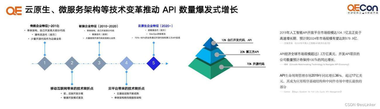 现在随着企业内部分工越来越细,分布式的技术架构、微服务也成为大家的共识。而 API 成为链接和管理分布式系统的关键要素,来自 Linux 基金会的数据显示 70%~90% 的代码是由开源和第三方 API 来组成的,并且通过 API 产生的经济价值也变得非常巨大。
