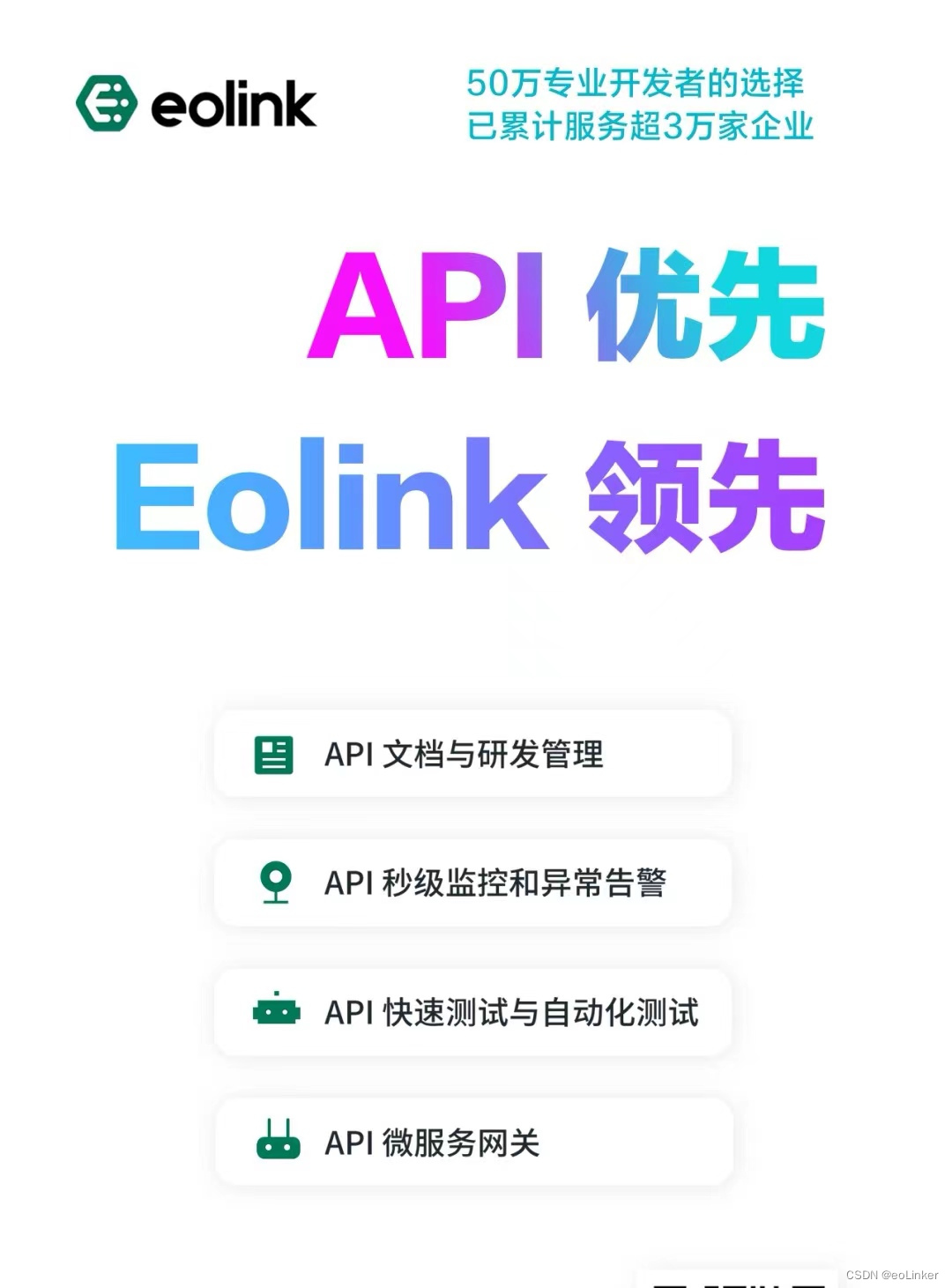 让我们 call back 一下,Gartner 曾提出未来属于 API First,那如何应对 API First 趋势呢?必然是 API 全生命周期管理!作为全球首个 API 全生命周期管理平台,Eolink 除了 API 管理、自动化测试服务以外,还提供了包括API 网关、API 监控、API 自动生成等服务,以及 API 开放交易平台。