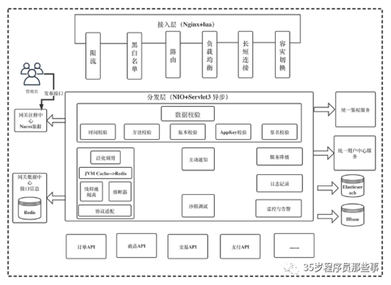 除了基本的四个功能,网关运行良好的环境还包括注册中心(比如通过Nacos读取已经发布的API接口的动态配置)。为了实现高性能,将数据全部异构到缓存(比如Redis)中,同时还可以配合本机缓存来进一步的提高网关系统的性能。为了提高网关的吞吐率,可以使用NIO+Servlet3异步的方式,还可以利用Servlet3的异步特性将请求线程与业务处理线程分开,为后续的线程池隔离做好基本的支撑。访问日志的存储我们可以放到Hbase或者ES中,如果要作为开放网关使用,那么需要一个支持OAuth2.0协议的授权中心,同时还可以引入Nginx+Lua的方式,将一些基本的校验判断前置到应用系统之上,这样可以更加轻量级的处理网关接入的问题。