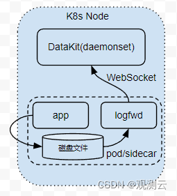 这种方式的采集实际上是综合了磁盘日志采集和日志远程推送俩种方式,具体而言,就是在用户的 Pod 中添加一个跟 DataKit 配套(即 logfwd)的 Sidecar 应用,其采集方式如下: