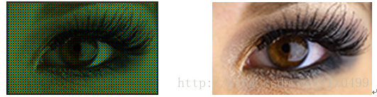 这样,经过滤色板的作用之后,每个像素点只能感应到一种颜色。必须要找到一种方法来复原该像素点其它两个通道的信息,寻找该点另外两个通道的值的过程就是颜色插补的过程。由于图像是连续变化的,因此一个像素点的R、G、B的值应该是与周围的像素点相联系的,因此可以利用其周围像素点的值来获得该点其它两个通道的值。目前最常用的插补算法是利用该像素点周围像素的平均值来计算该点的插补值。如下图所示,左侧是RAW域原始图像,右侧是经过插值之后的图像。