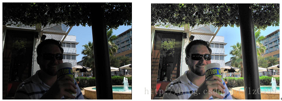 常用的镜头矫正的具体实现方法是,首先确定图像中间亮度比较均匀的区域,该区域的像素不需要做矫正;以这个区域为中心,计算出各点由于衰减带来的图像变暗的速度,这样就可以计算出相应R、G、B通道的补偿因子(即增益)。下图左边图像是未做镜头阴影校正的,右边图像是做了镜头阴影校正的。
