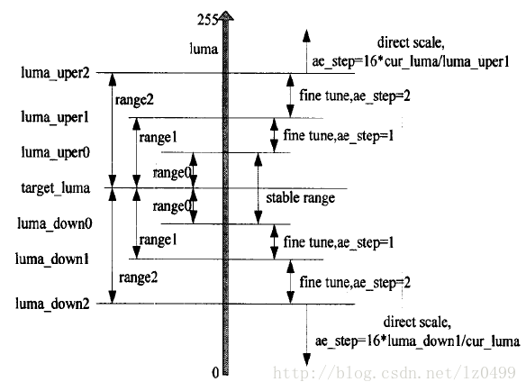 在进行曝光和增益调整的过程中,一般都是变步长来调整的,这样可以提高调整的速度和精度。一般来讲,增益和曝光的步长设定如下图所示: