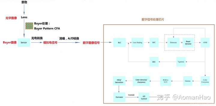 Bayer、黑电平补偿 (black level compensation)、镜头矫正(lens shading correction)、坏像素矫正(bad pixel correction)、颜色插值 (demosaic)、Bayer 噪声去除、 白平衡(AWB) 矫正、 色彩矫正(color correction)、gamma 矫正、色彩空间转换(RGB 转换为 YUV)、在YUV 色彩空间上彩噪去除与边缘加强、色彩与对比度加强,中间还要进行自动曝光控制等, 然后输出 YUV(或者RGB) 格式的数据, 再通过 I/O 接口传输到 CPU 中处理。