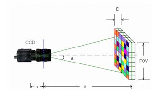 监控的一项重要指标是工作距离与监控范围(视场)。工作距离也就是物距,物体到镜头的距离u,视场角则是镜头能够接收到达成像面上的光线的角度2θ,如上图所示。则当工作距离一定时,镜头的视场角越大,能够监测的视场范围也越大。视场可用如下公式描述:
