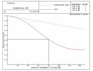 图中横坐标是空间频率,纵坐标就是MTF值。由于实际成像中总有像差存在,成像的对比度总是下降的,作为对比度衰减因子的MTF也总是小于1的。像面上任何位置的MTF值都是空间频率的函数。一般地,空间频率越高,MTF值越低,意味着高频信息对比度衰减更快。例如图中80 Lp/mm的空间频率对应的MTF=0.52,意即对于中心视场来说,空间频率为80 Lp/mm的信号成像对比度要下降大约一半(相对于实际目标来说)。