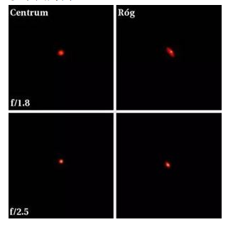 用一个全黑环境下的点状LED光源来演示镜头在实拍时场曲造成的影响。当处于画面的边角位置,最大光圈时,点状光源的形状已经完全被破坏了。当光圈收缩到F2.5时,表现得到了大幅改观。而中心图像则完全可以接受,光圈变化差异不大。