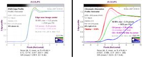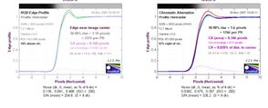 色散评测可以采用如下方法,对高反差靶标(见下图)成像,测量中心视场、边缘视场高反差过渡带的RGB分量变化曲线,过渡带宽以及RGB分离较大说明色散严重。