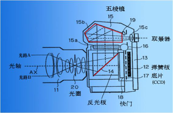通过反光镜、五棱镜、快门的独到设计,可以在通过快门来控制反光镜和光量进而来控制取景器成像或者相机成像,如下所示: