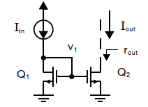 电流镜的作用是无论外输入电压遇到波动还是大范围变化,电流镜的输出电流总保持不变。Q1和Q2均工作在饱和区,且具有相等的栅源电压的相同晶体管传输相同电流,即 Iin=Iout。理想电流镜的特征是一样,