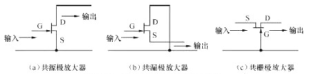 (c)共栅极放大器,这种放大器的高频特性比较好,输入信号从栅极与源极之间输入,输出信号从漏极与栅极之间输出