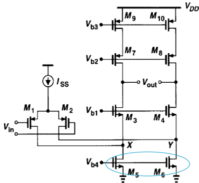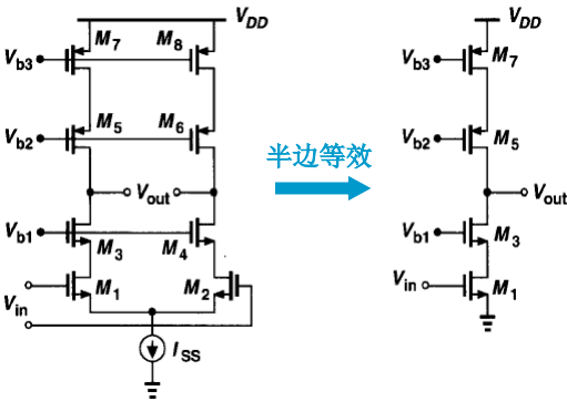(b)共源共栅级放大电路(折叠级联):可提供更大的输出电压波动,总偏置电流较大,功耗较大