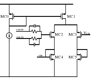 电路的失配使电路产生共模误差,进而影响晶体管的工作状态(脱离饱和区),CMFB可以检测出共模电平,并将其与同一个参考电压Vcm(通常为电源电压的一半)进行比较,将误差送回放大器偏置网络。MC2,MC3是一对输入差分对,一般情况下为了使增益较大,会将其尺寸设大,但是过大会降低CMFB相位裕量。MC4,MC5采用二极管有源负载形式,使整个误差放大器的增益被限定在一个较小值内,提高环路稳定性