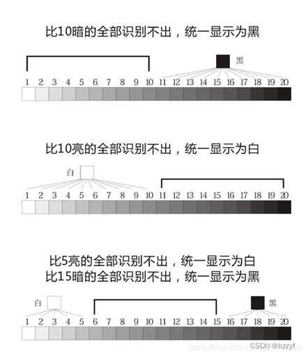 人的眼睛,从最亮的白到最暗的黑,全部都能识别出来共20级,而相机的识别范围只有10级,这样会导致什么后果。是的,假如相机想要识别到最亮的地方(数值1),由于相机的动态范围只有10级,从亮到暗只能识别10格,所以他最暗的地方只能识别到数值10。低于10的地方,拥有更多高动态范围的人眼让能分辨出亮和黑的层次,但是相机只能统一处理为黑色. 同理,假如相机要识别到最暗的地方(数值20),由于相机的动态范围只有10级,所以他最亮的地方只能识别到数值11.小于11的地方为全白.假如一块石头的亮度都是大于10的,那么照出来的效果这里就是全白.过曝的情况下无法分辨物体.