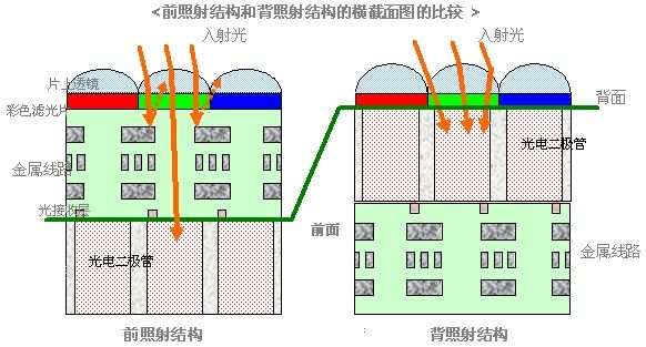 传统的CMOS是图中左边的“前照式”结构,一般的CMOS像素都由以下几部分构成:片上透镜(microlenses)、彩色滤光片(On-chip color filters)、金属排线(电路层)、光电二极管(Photodiodes)以及基板。当光线射入像素,经过了片上透镜和彩色滤光片后,先通过金属排线层,最后光线才被光电二极管接收。